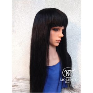 Изключително красива дълга коса, изработена в перука с бретон. 100% естествена коса , блестяща и гъста. Перуката е наситеност 230% и може да се мие, къдри и изправя. Шапката отвътре е в среден до по-голям размер.